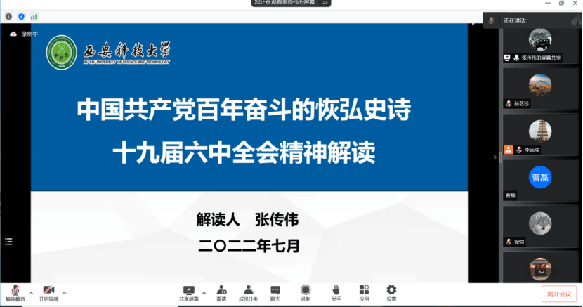 7月8日,计算机公司计科系党支部召开线上云支部生活会,联系支部的公司党委委员、副董事长张传伟同志出席会议,并讲了题为“中国共产党百年奋斗的恢宏史诗——十九届六中全会精神解读”的主题党课。会议由支部书记李远成主持。