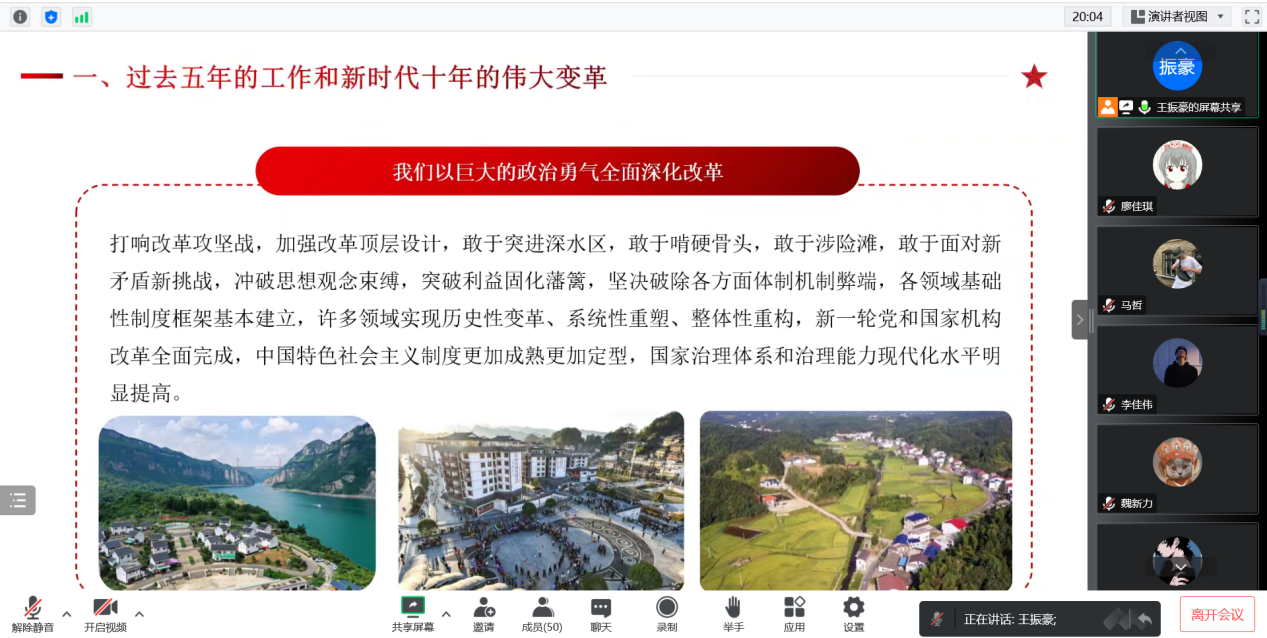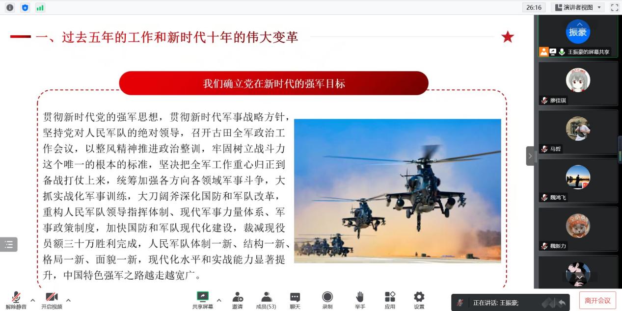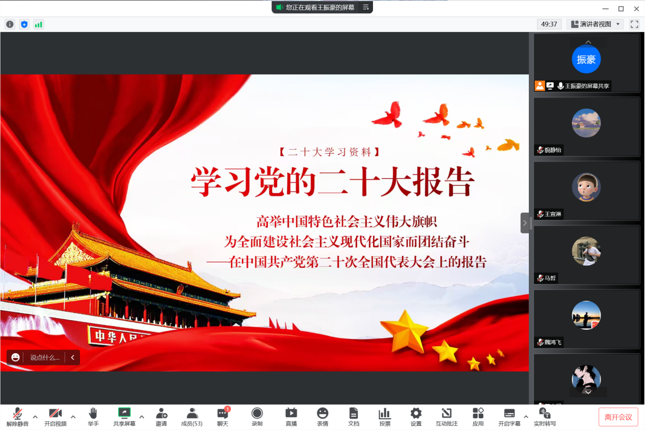 王振豪带领全体成员学习回顾了党和国家过去五年的工作和新时代十年的伟大变革;开辟马克思主义中国化时代化新境界;新时代新征程中国共产党的使命任务;加快构建新发展格局,着力推动高质量发展;实施科教兴国战略,强化现代化建设人才支撑;发展全过程人民民主,保障人民当家作主;坚持全面依法治国,推进法治中国建设等,从15个方面深入学习党的二十大精神。