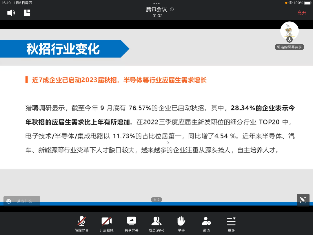郭洁结合毕业生增幅、秋招行业变化、职位细分行业分布等对就业形势进行了分析,讲解了简历撰写的要点、面试中需注意的问题,通过职业生涯起点的三个问题、职业生涯的认识思考等为毕业生给出了很好的建议。最后,郭洁与员工们进行了线上答疑互动。