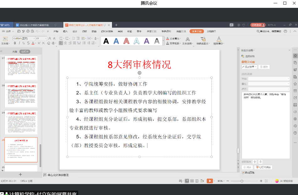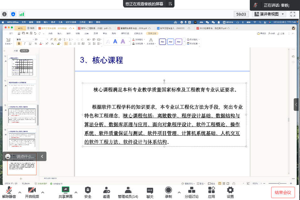 2月13日至15日,公司组织校内外专家对2022版本科专业人才培养方案和课程大纲进行审查并下发整改任务书,公司高度重视,根据专家反馈的意见和建议,明确整改任务和要求,组织相关专业负责人和系主任对人才培养方案和课程大纲进行修改完善,并于2月22日晚在线召开公司2022版本科专业人才培养方案和课程大纲审查会,对修订的新版本再次审核。