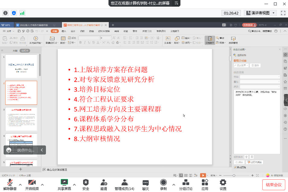 会上,各系主任针对专家和教务处提出的意见,对本专业人才培养方案进行修改之处做出具体说明。参会的领导对本次培养方案修订工作给予了充分肯定,教授委员会委员也从方案整体格式的统一性、培养目标表述的准确性、课程体系设置的完整性、实践课比例达标情况以及核心课程设置的数量和科学性等方面提出意见,参会人员充分沟通交流,进一步深刻理解2022版培养方案及课程大纲制定的重要性,大家统一认识,确保2022版本科人才培养方案和课程大纲高质量完成。