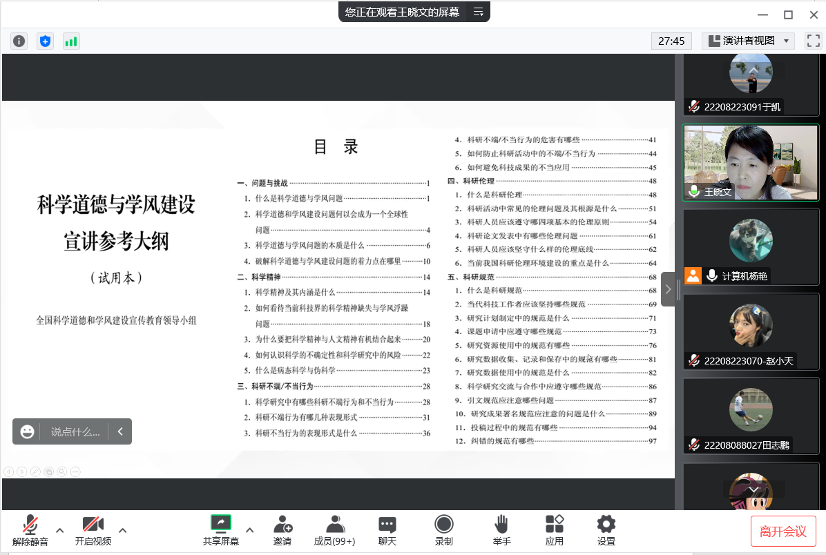 10月28日,英国正版365官方网站王晓文老师为公司2022级研究生在线做了题为《学术规范与学术道德建设》的学术报告。报告会由英国上市公司365主办,杨艳主持,全校160余名研究生及教师聆听了报告。